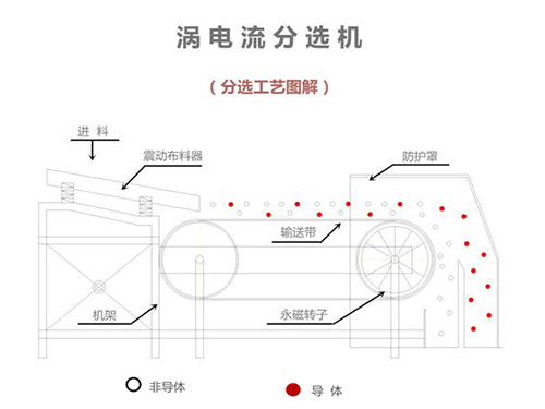 該機工作時會在分選磁輥表面產生高頻交變的強磁場,當導電的有色金屬進入磁場分選區時,會在金屬塊內部感應出渦電流,此渦電流本身會產生與原磁場方向相反的磁場,有色金屬(如銅、鋁等)則會因磁場的排斥力作用而沿其輸送方向向前飛躍,實現與其它非金屬類物質的分離,達到分選的目的;其主要區分離判段依據是物料導電率和密度的比率值,比率值高的較之比率低的物料更易分離。
